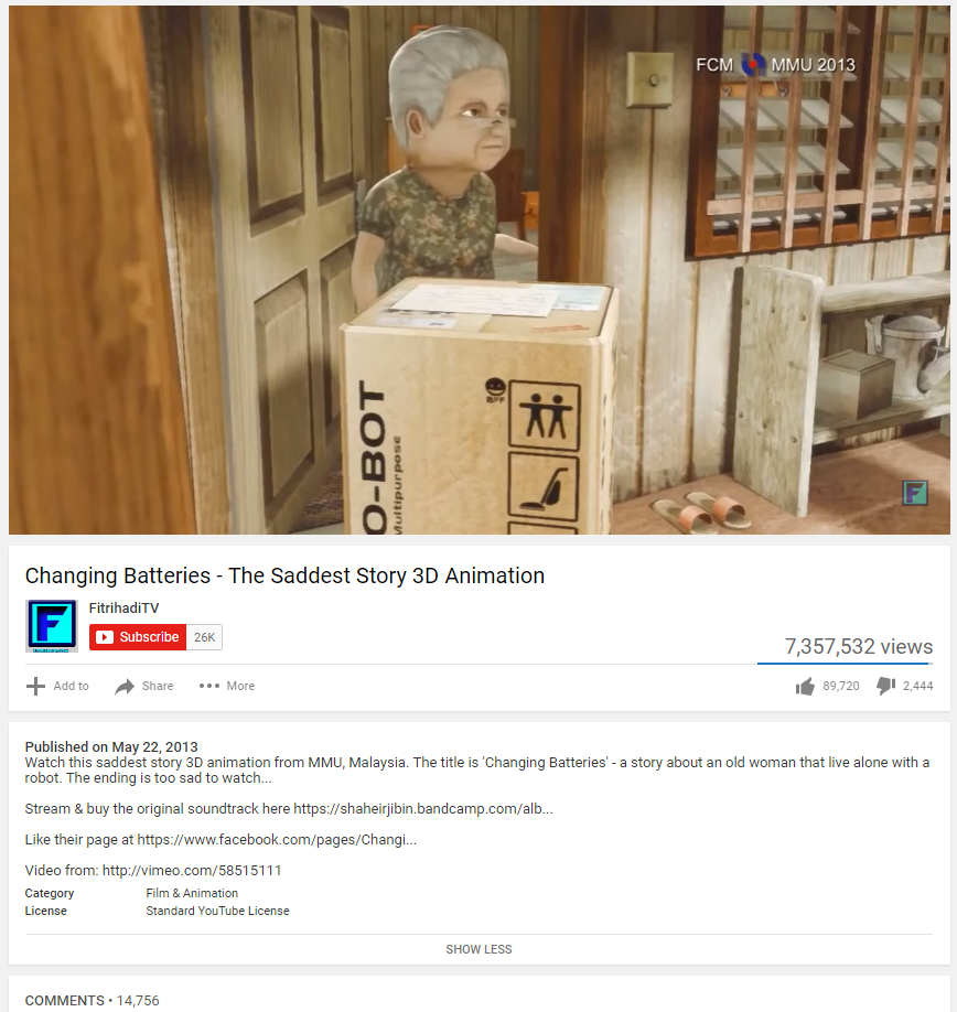 Changing Batteries is made as a final year project for our university. It tells the story of an old lady who lives alone, and she receives a robot one day. The story tells of their relationship development.
