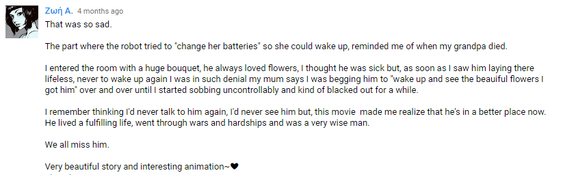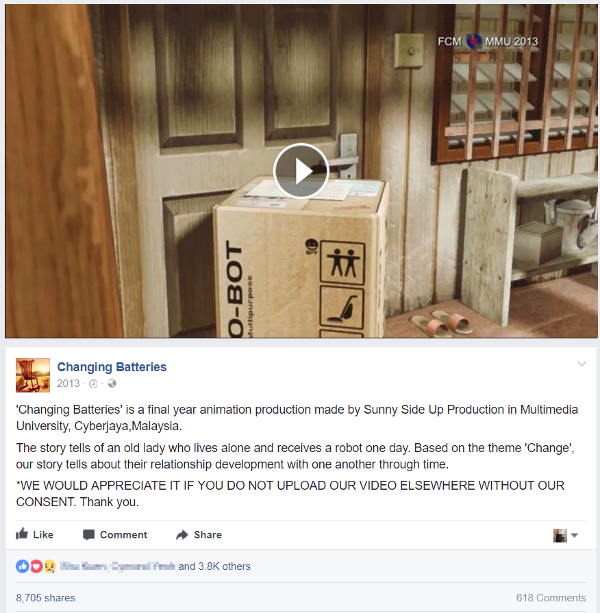 这是一部独居老太太和机器人的一段动画小故事,是由Sunny Side Up Production 在大马赛城多媒体大学 (Multimedia University, Cyberjaya)制作的动画。