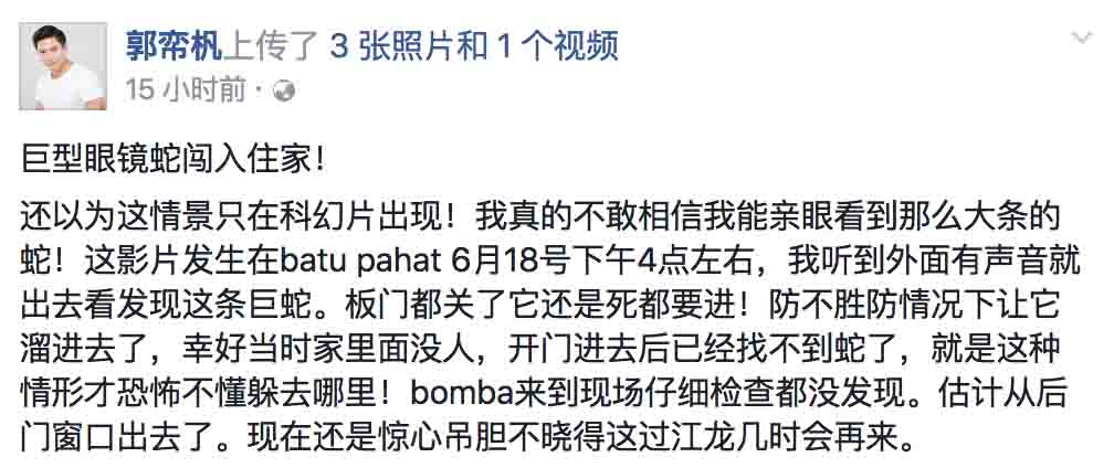 ▼一名大马男子在脸书上传了一段视频表示自己的住家来了一只不速之客!这只「客人」有个称号就叫做「过江龙」!