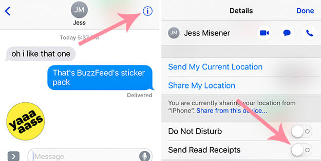 打开iMessage 然后按右上角的 ‘i’ 键,然后滑下就能找到 Send Read Receipts关闭。