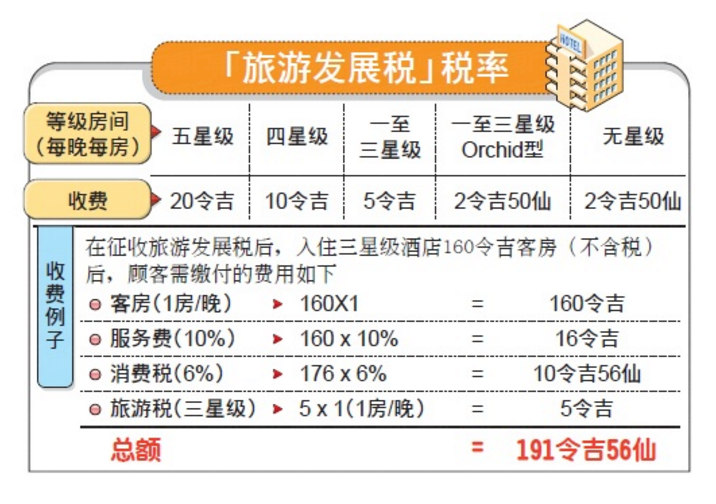 这项「旅游发展税」的税率为五星级酒店每晚每房徵收20令吉、四星级酒店每晚每房10令吉、一至三星级酒店每晚每房5令吉、一至三星Orchid型客房每晚每房2令吉50仙及无星级客房则每晚每房2令吉50仙。