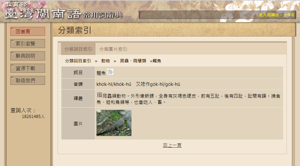 4.鳄鱼-kho̍k-hî/kho̍k-hû 又唸作go̍k-hî/go̍k-hû【发音 】