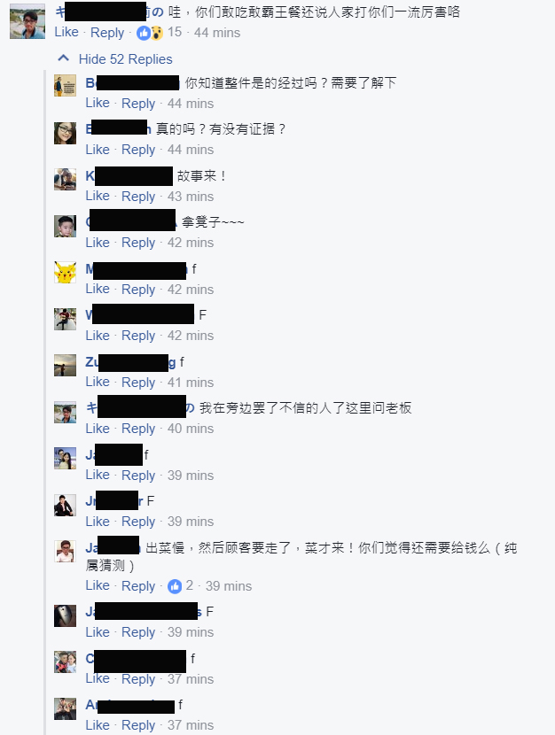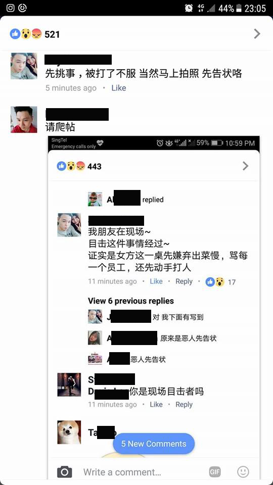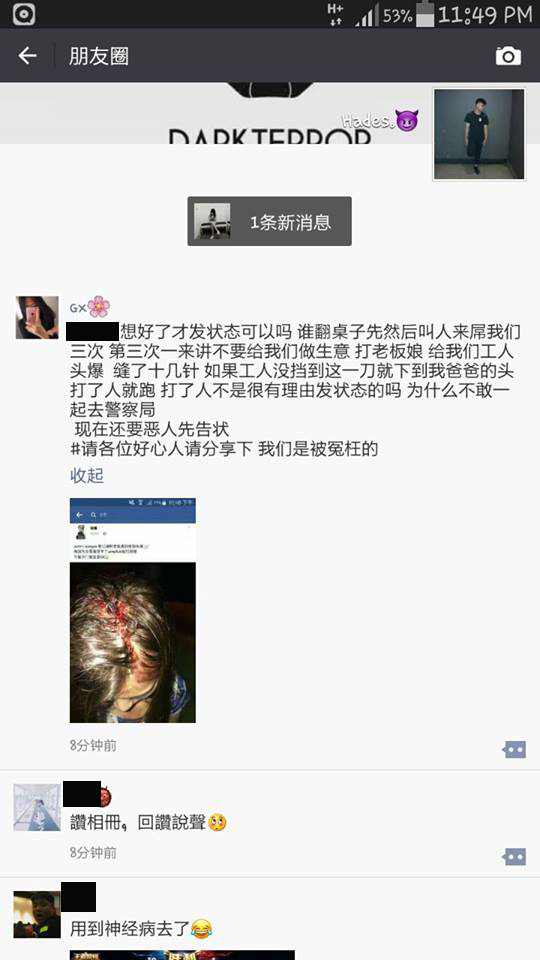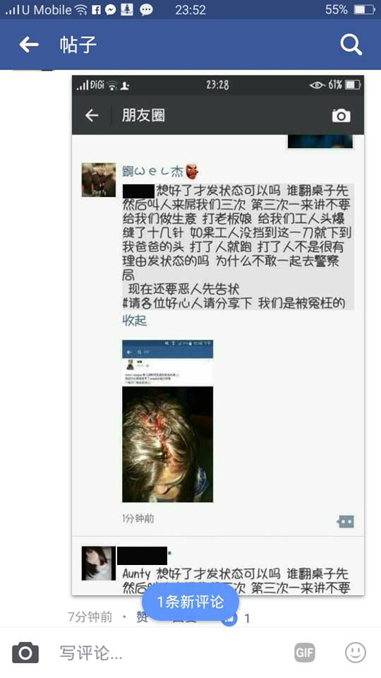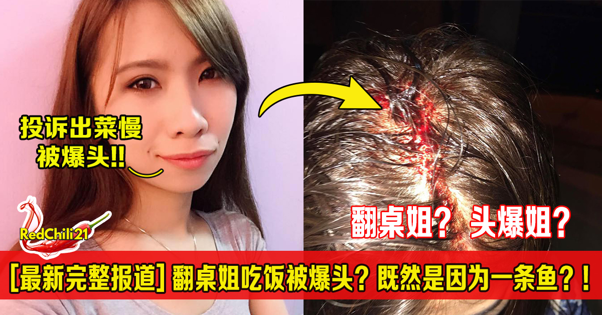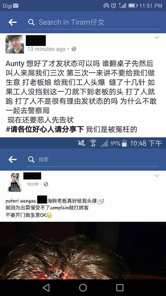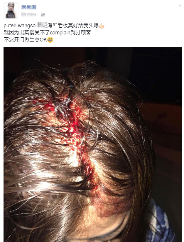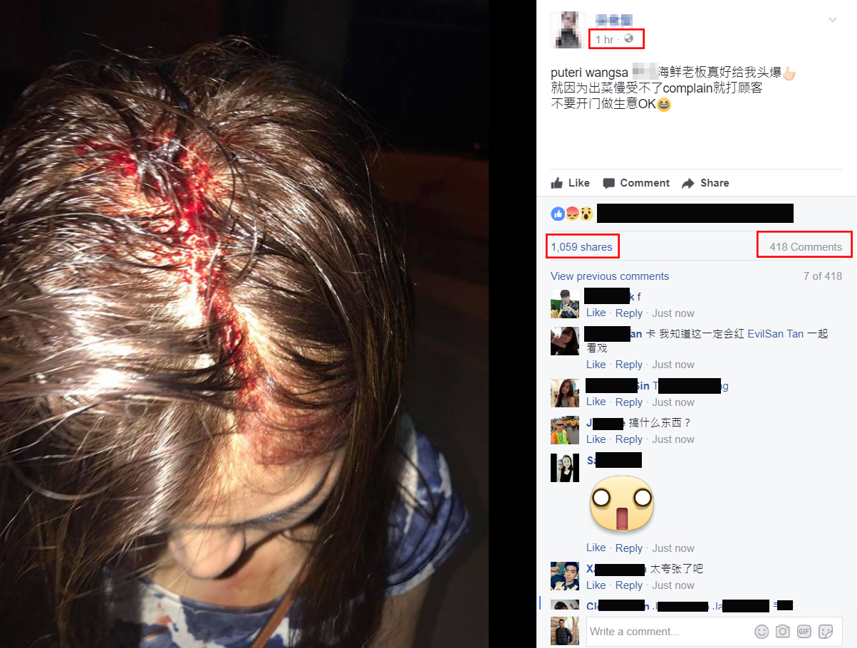 ▲ 昨晚女事主发帖子表示被海鲜饭店的老板爆头还把照片上载到自己的脸书上,不到1小时已累积了1059 shares 和418 个留言 。事主说是因为出菜慢然后complain 才被爆头!!