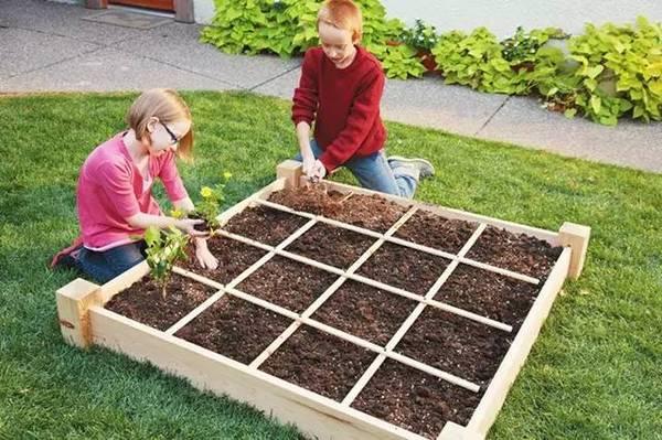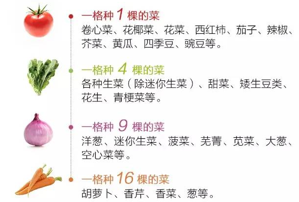 将木板条或绳子固定在木框上,将小菜地划成4行4列,总共16小格。注意木板条或绳子只是把菜地表面划成格子,并没有把下面的土隔开。在种植箱上放上网格,每格约30厘米,网格使1米菜园更整洁,也能更好地组织植物。在每一个格子里种上一种蔬菜,根据植物大小和生长习性,每格可以种1,4,9,或16棵。