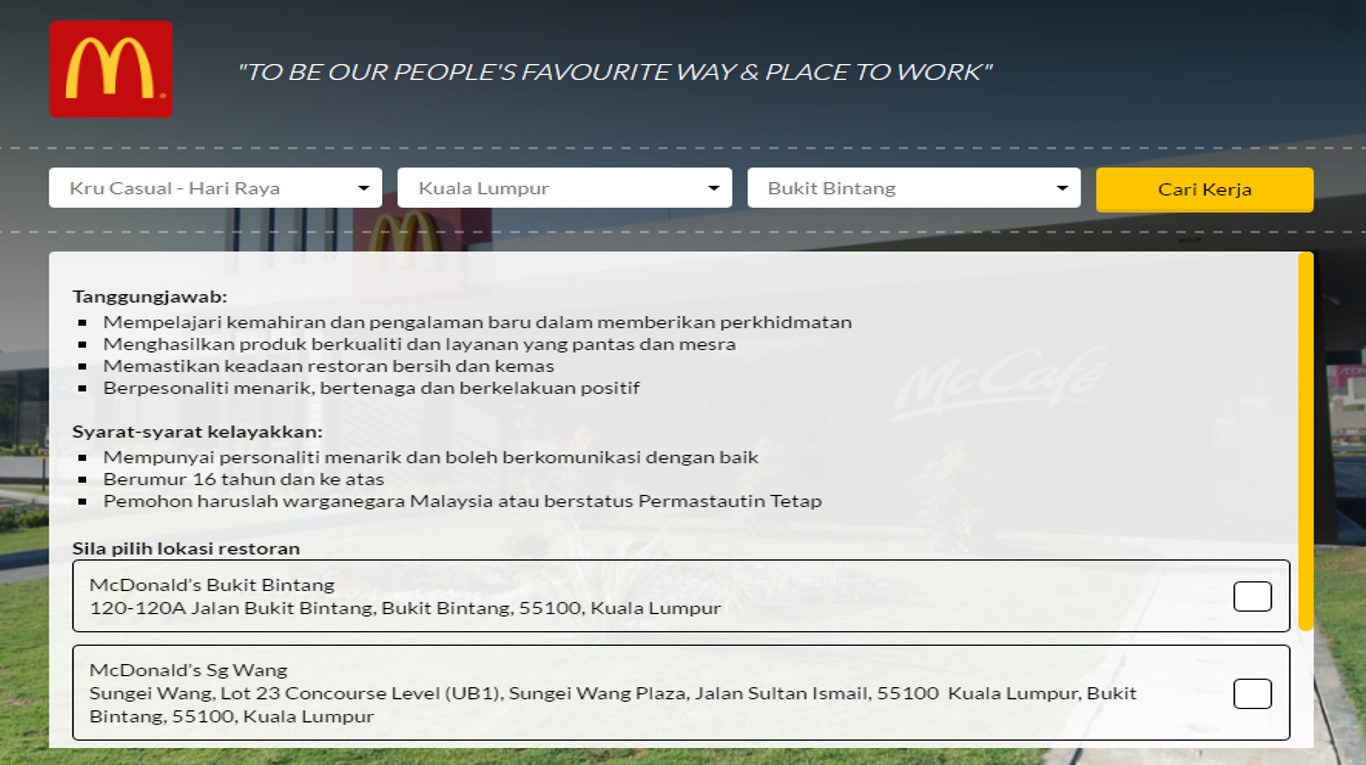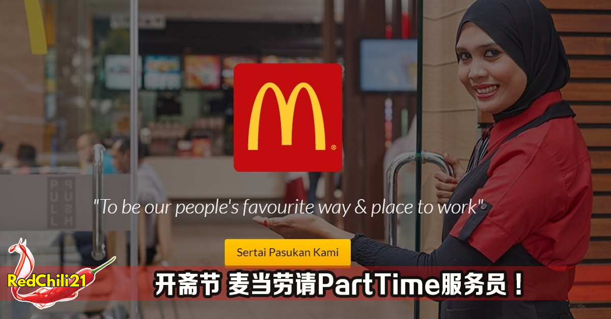 因为斋戒月和开斋节期间麦当劳面对人手不足的情况,所以现在正在聘请开斋节期间的Part time 服务员哦!!
