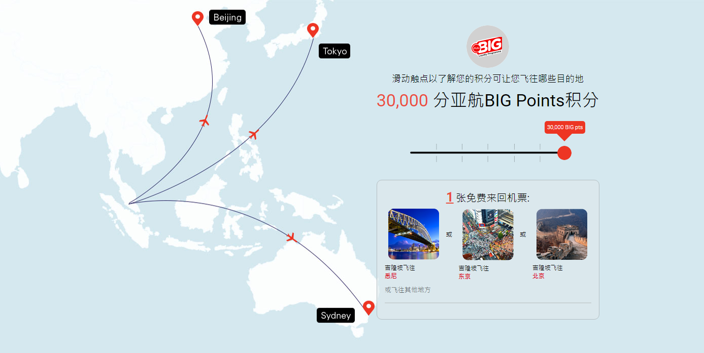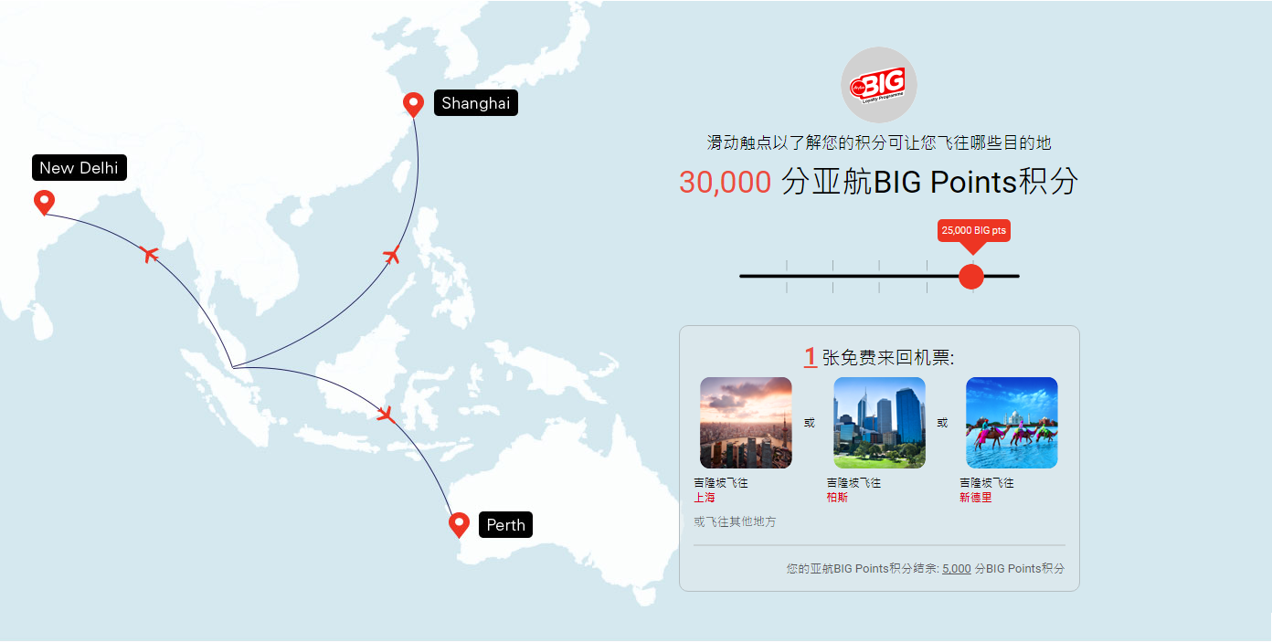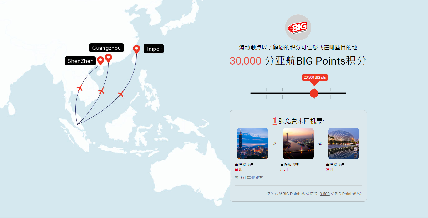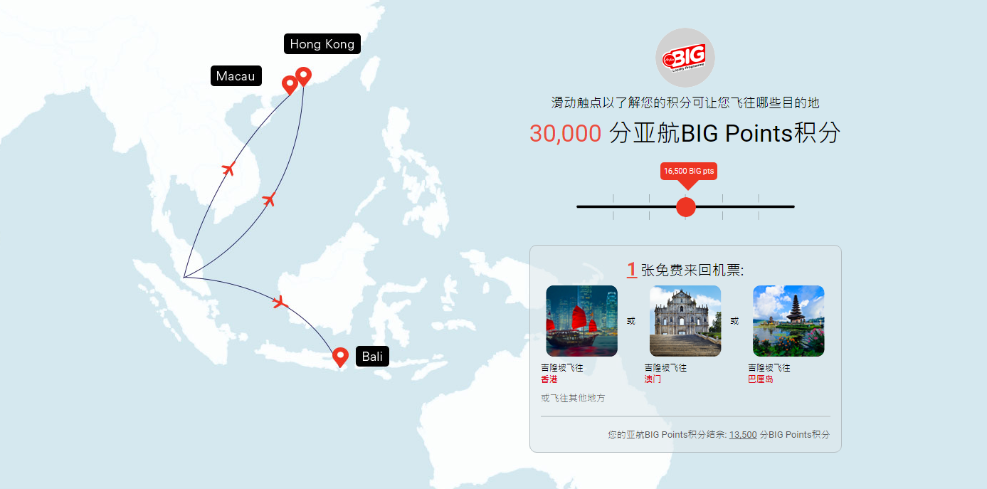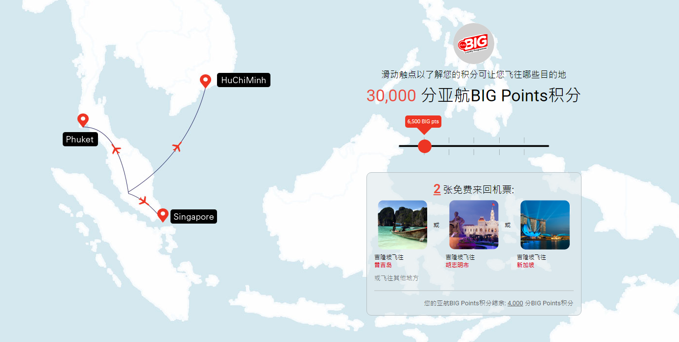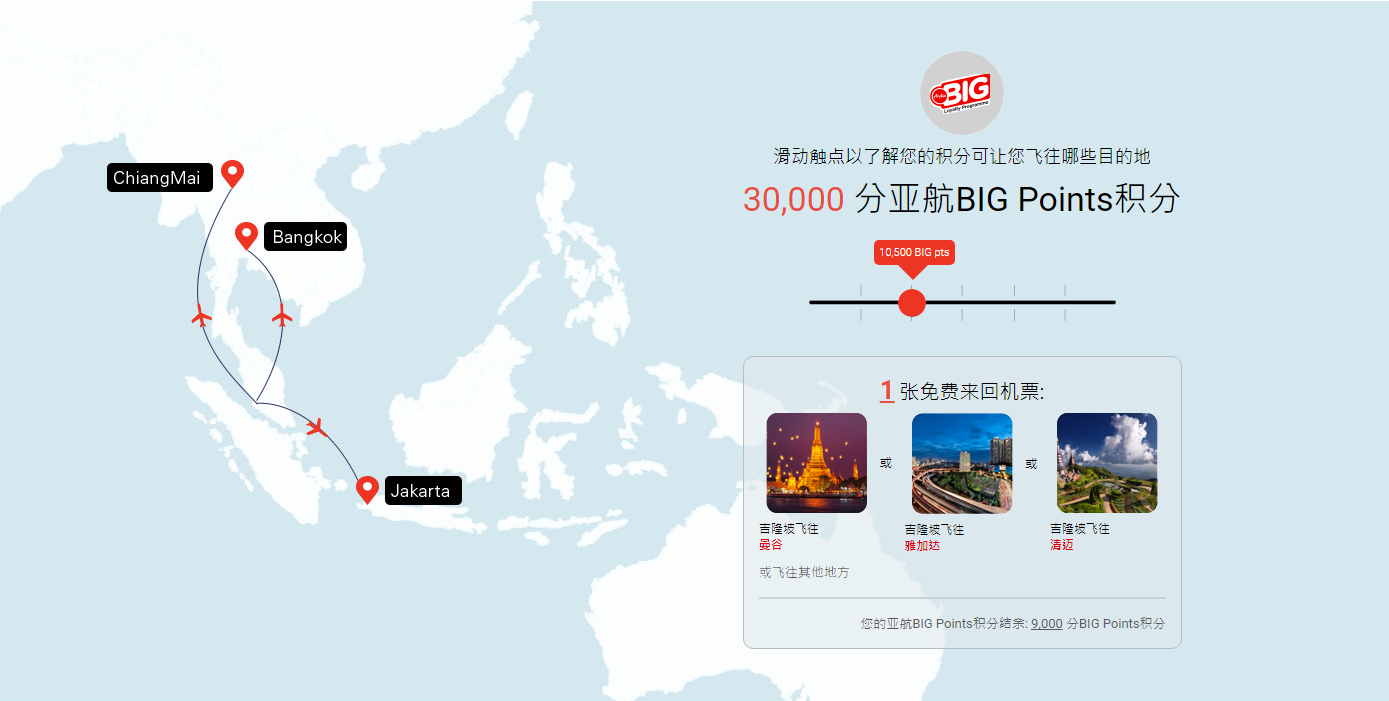 30,000分亚航BIG Points可以换取1张以上地点的免费来回机票,而且换取后你的亚航BIG Points 积分结余: 9,000 分BIG Points积分