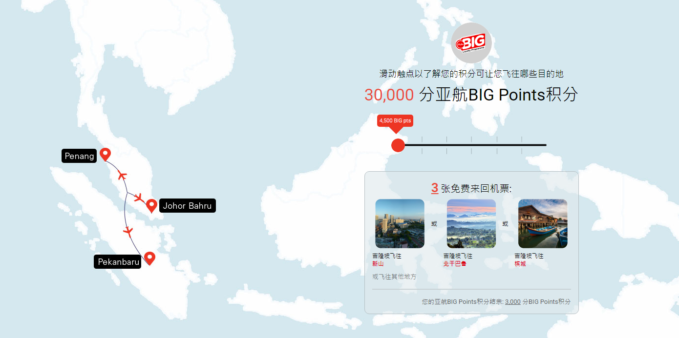 30,000分亚航BIG Points可以换取3张以上地点的免费来回机票,而且换取后你的亚航BIG Points 积分结余: 3,000 分BIG Points积分