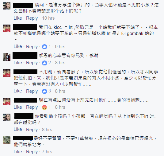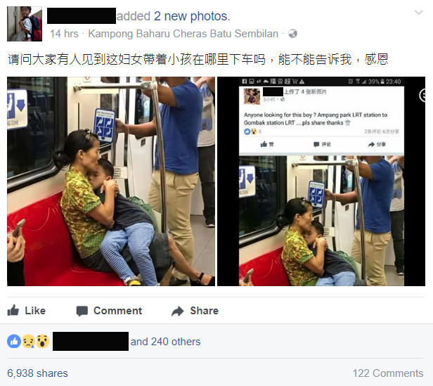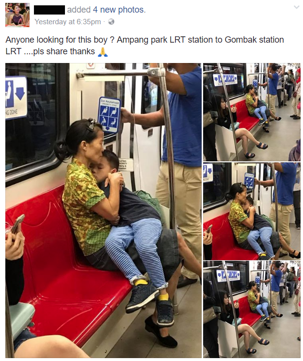▲ 6月17日,这位网友上传了 4张照片到脸书上写道: 有没有人找着这个小孩 ?从Ampang Park LRT 往 Gombak LRT 的方向,她请求网友们把这个照片分享出去.
