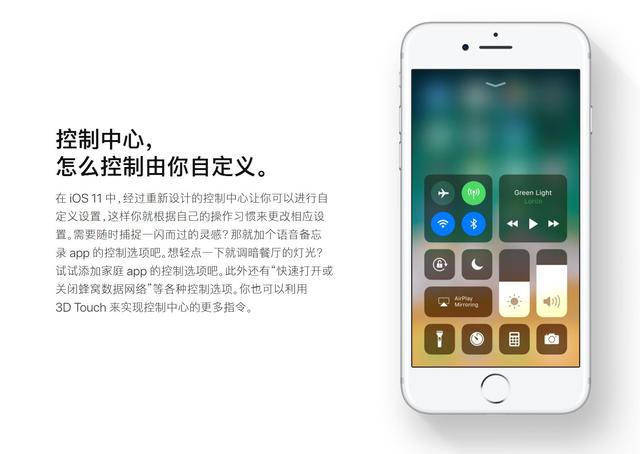 屏幕亮度、音量和音乐控制面板都用上了 3D Touch,可以更精确控制调整幅度,和提供更多功能。