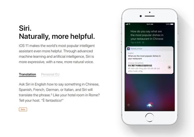 苹果通过智能学习技术,让 Siri 的语音语调变得更加自然、更接近真人语言节奏。beta 版的翻译功能现身,目前支持英文与中、法、德、意、西五国语言的语音翻译。