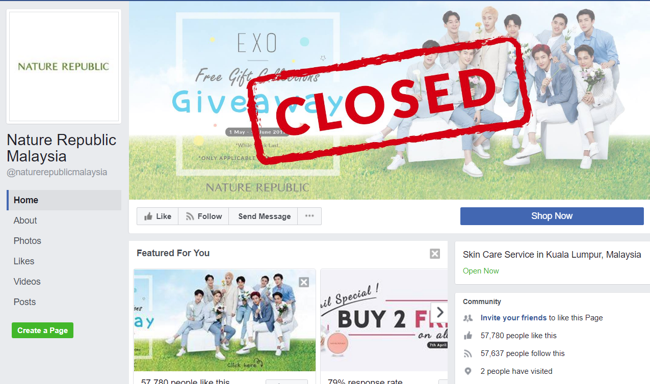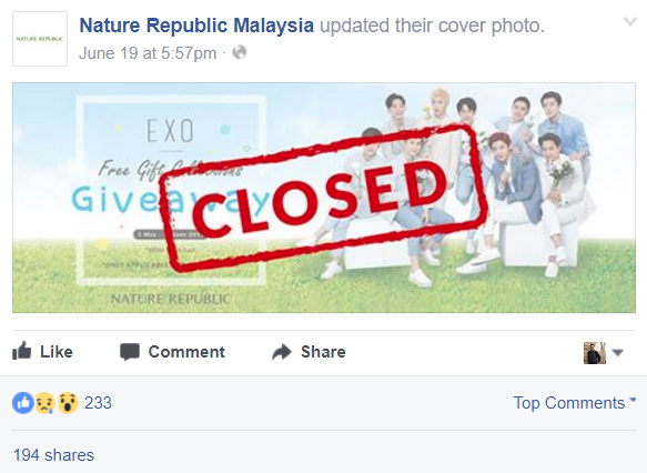大马Nature Republic面子书专页宣布大马Nature Republic全国的11间分行即将全面关闭。