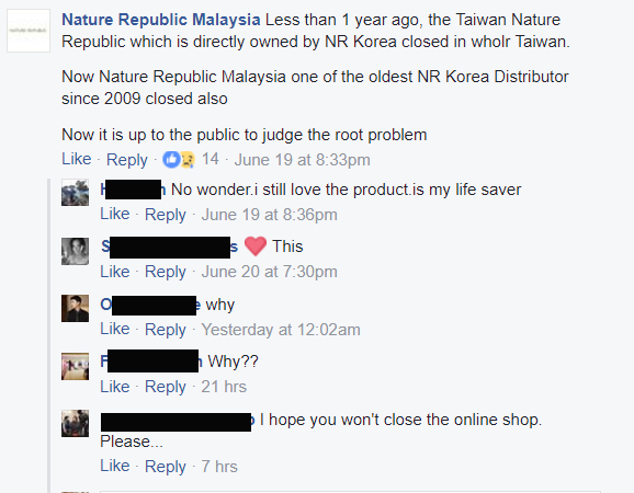 ▼自Nature Republic 在脸书上发文将关闭全马的11分行,支持者都不能接受这个消息。