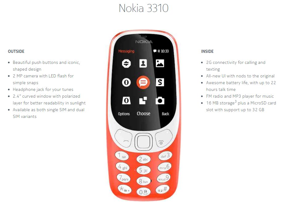 值得一提的是,新款诺基亚3310可以待机一个月。很显然这款功能机是为新兴国家设计,预计将会在今年第二季正式开卖。