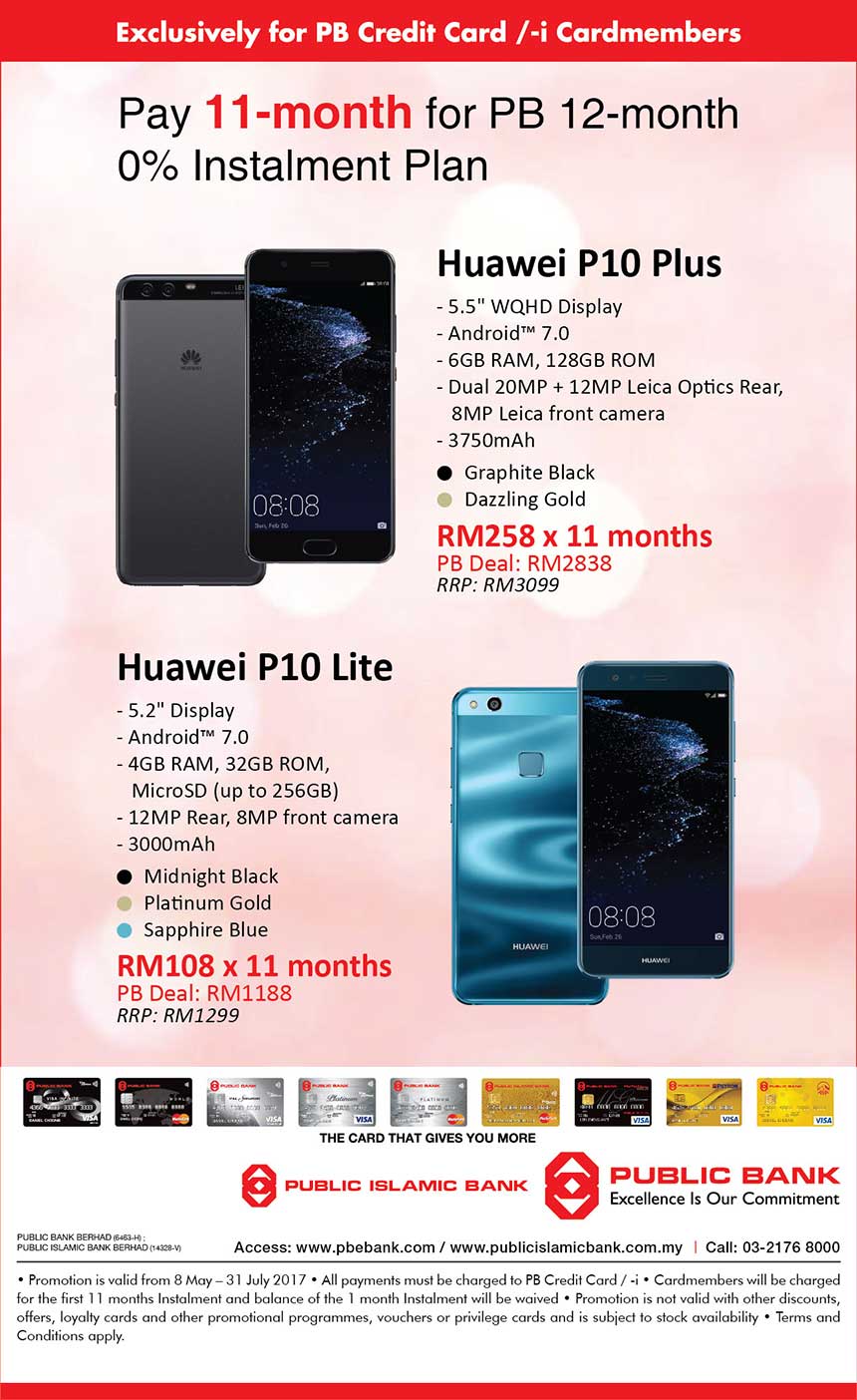 哪里买Huawei P10 Plus 最划算?应该就是在Public Bank 了?没错,在Public Bank也能买到Huawei P10 Plus 哦!而且还给你分成12月付款【0%利息分期付款】。
