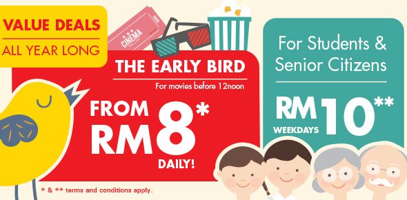 The Early Bird 促销是每天早上至中午12点时播放的电影的戏票一律只需RM8哦!
