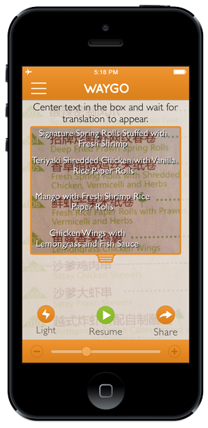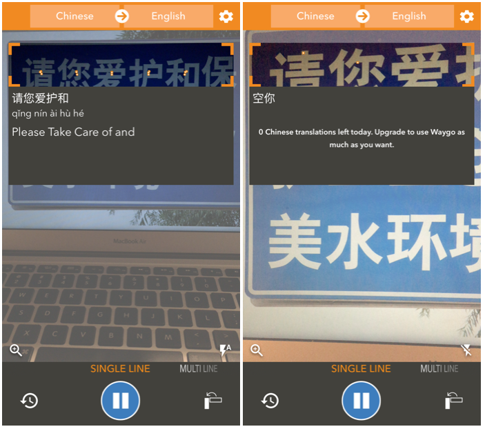 Waygo 主要针对的是亚洲的旅游者,而且跟菜单,招牌这些东西表现都很好,可以允许用户看到符合语义的翻译而不是一个字一个字的翻译,那样就会在事实上闹笑话。在其他的翻译软件当中会经常遇到那种情况。