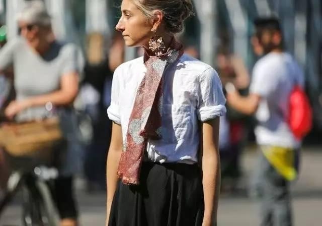 如果你有一条长条型丝巾大家都有,春夏季节,你不需要那种宽幅的超长型了。那是冬天的标配。你可以选择一些长度适中:挂在脖子上,两侧在腰际左右的款式。
