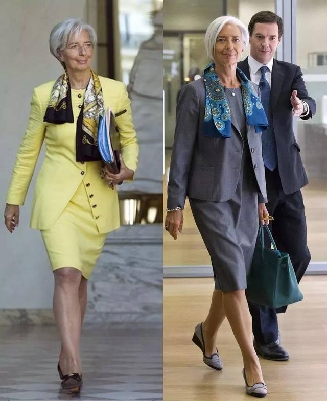 But,我们今天要讲的是她的标志造型:在西服外面不对称地把长条形丝巾挂在脖子上。可以称为「拉加德式」打法。