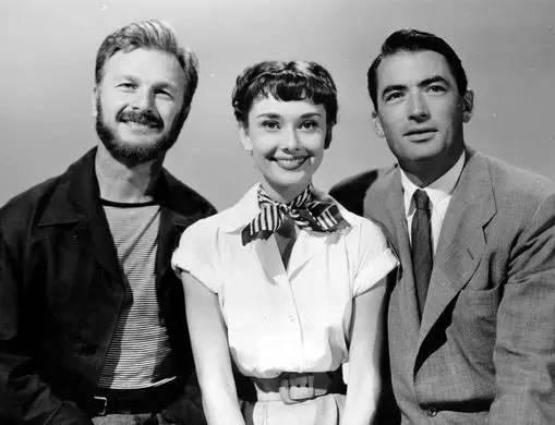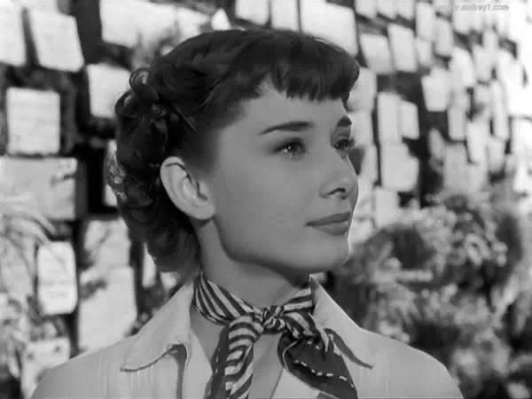 除了丝巾包头之外,把小方巾打个结,系在颈前也是当时非常流行的一种搭配法。比如,像《罗马假日》里奥黛丽•赫本饰演的出逃公主那样。