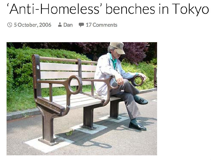 游民是一个世界性的问题,直到现在为止,人们也没有想出彻底的「解决办法」,只能尽力「照顾」。但为了维护城市的形象,一些地方的有关部门根本不愿意花时间和精力照顾那些露宿街头的游民,反而想尽办法要把他们驱逐。下面就是一些城市为驱赶游民建造的设施,真是让人心凉。