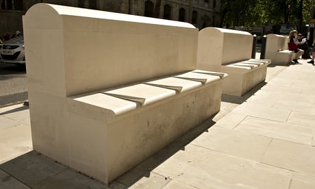 ▼伦敦皇家法院外的长椅:凹凸不平,躺上去不舒服。