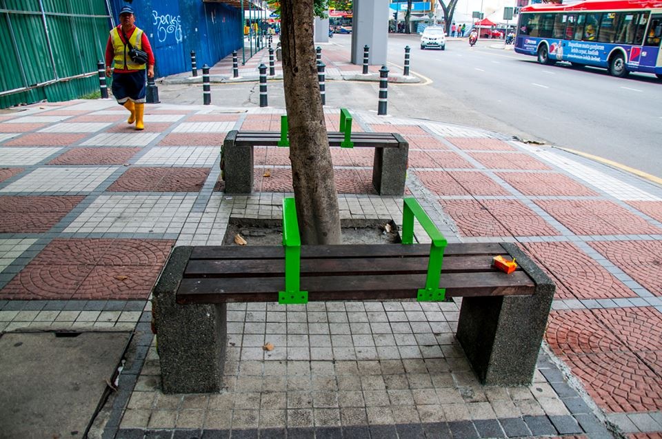 ▼马来西亚, 吉隆玻:市区的座椅都装上了铁栏杆来阻止流浪汉躺着睡觉。