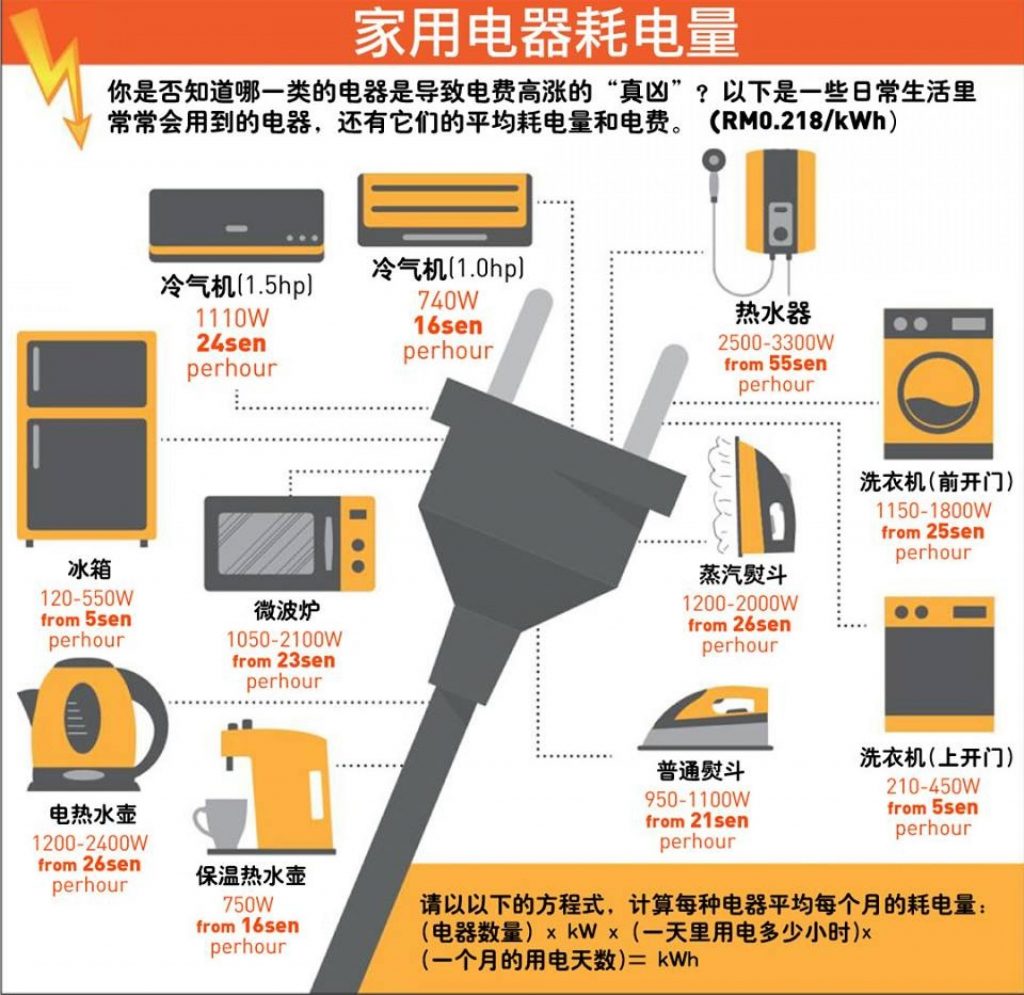 ▼以下是一些日常生活里常常会用到的电器,还有它们的平均耗电量和电费。这里的电费计算单位是 RM 0.218 kWh。