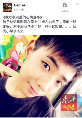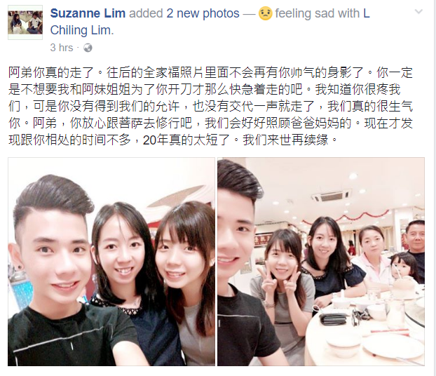 ▼ 今天大姐林舒闲在面子书贴出了两张和小弟的合照,然后写道:往后的全家福照片里面不会再有你帅气的身影了!看了这番话不禁让人感到了心酸,也能在字眼中感受到姐姐对弟弟的关爱和失去弟弟的痛。
