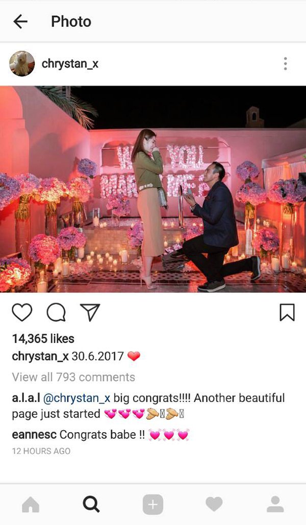 in 新闻, 首页 超強“黃金配對”,“高富帥”向“白富美”求婚! by RedChili July 2, 2017, 11:34 am 纳莎(NAZA)集团副执行主席法立纳斯慕丁于上週五(30日),在摩洛哥向成功集团创办人丹斯里陈志远的长女陈雪铃求婚,后者也在Instagram上与众人分享喜悦。 亲友在其IG恭贺他们,有情人终成眷属,大家都期待已久,如今终於见证两人要结婚了,非常替他们开心。 她就是之前给大家介绍的马来西亚真正白富美之一! 【链接】 据瞭解,法利和陈雪玲在国际学校读书时认识,法利在马来社会中被公认为「高富帅」,可谓「钻石王老五」,相当有名气。 ~~~~ 还有太多的美照了,你们就自己上IG看吧! 陈雪铃Chryseis Tan Instagram 传送门。 Leave a Reply Cancel replyYour email address will not be published. Required fields are marked *Comment * Name * Email * Website Next post