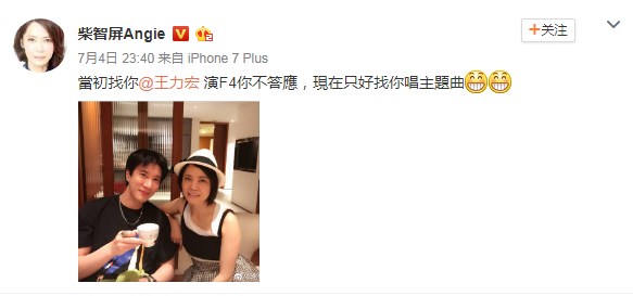 目前,正在筹拍新版《流星花园》的柴智屏,她开玩笑地问王力宏,“当初找你演F4不答应,现在只要找你唱主题曲了。” 而王力宏则回应,“你先找到你的新F4成员,我才知道怎么写吧!” 貌似两人对此次的合作已经有了共识哦!