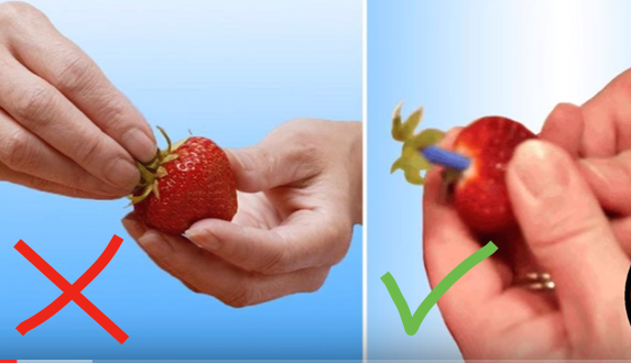 用筷子或吸管从尾部穿上去比较完美又不会捏烂草莓