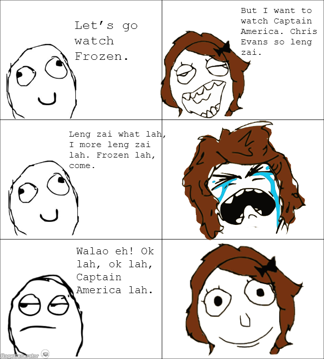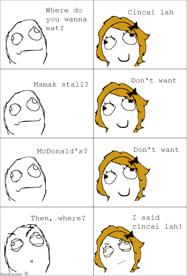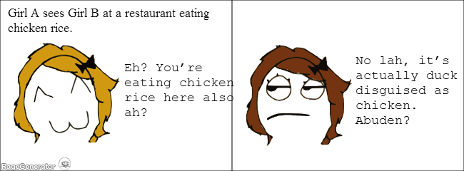 女生A: Eh, 你也来这里吃鸡饭ah?