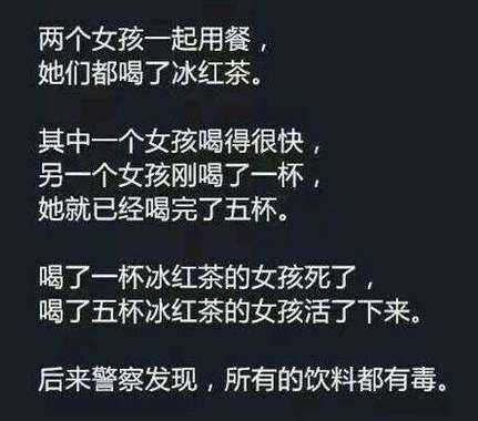 毒在冰块裡,一个女孩喝了五瓶,说明她喝的很快,而冰裡的毒还没化开,而另一个女孩只喝了一杯,首先她喝得很慢,而冰裡的毒有足够的时间化开在饮料裡,所以她把有毒的饮料喝了,于是中毒身亡。