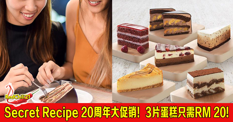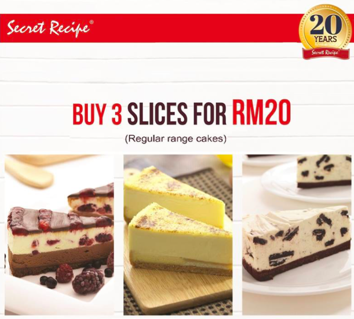 Secret Recipe 20周年大促销! 配合Secret Recipe 20周年纪念,Secret Recipe 将举行特别促销优惠,3片蛋糕只需RM 20!!