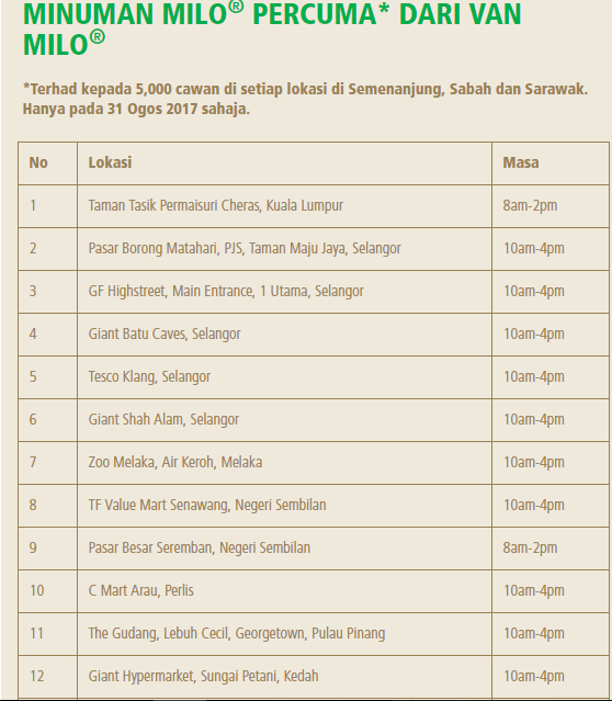 这项促销仅限于8月31日当天的指定时间和地点罢了。雀巢公司将在全马的35个地点,出动Milo Van 免费派送Milo 饮料给民众,每个Milo Van 将免费派送5000杯的Milo 饮料。