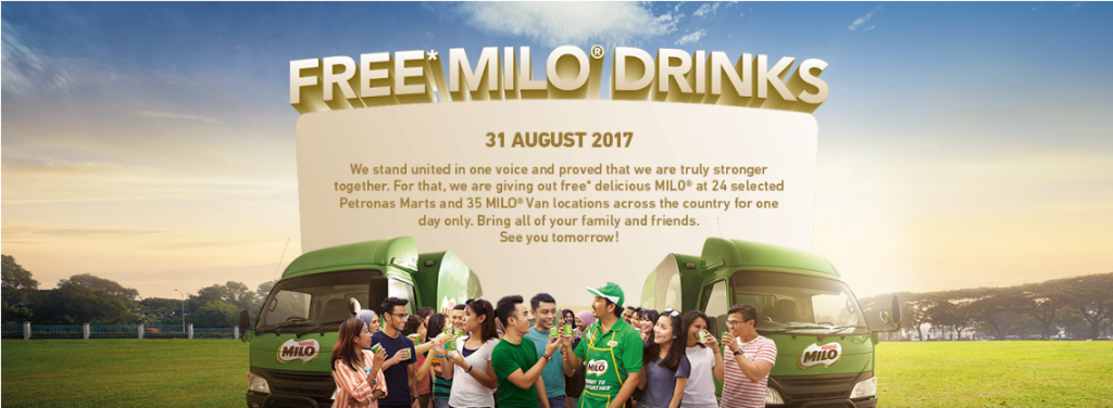 美禄Milo 是全马人最爱的饮料之一,还记得小时候在学校时,总是期待着Milo Van 前来学校派送免费的Milo 饮料吗?而如今配合8月31日马来西亚国庆日,雀巢公司也将在8月31日当天,在全马各地免费派送Milo 饮料!