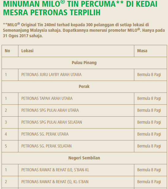 另外,Milo 公司也将在指定的24家Kedai Mesra Petronas,免费派送Milo Original Tin 240ml给予民众,每家分行仅限于300罐罢了。