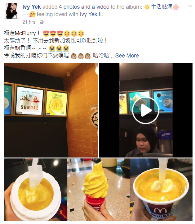 昨日网友 Ivy Yek 在面子书发帖说:不用去到新加坡也可以吃到榴莲McFlurry啦!马上得到了很多网友的留言和分享。