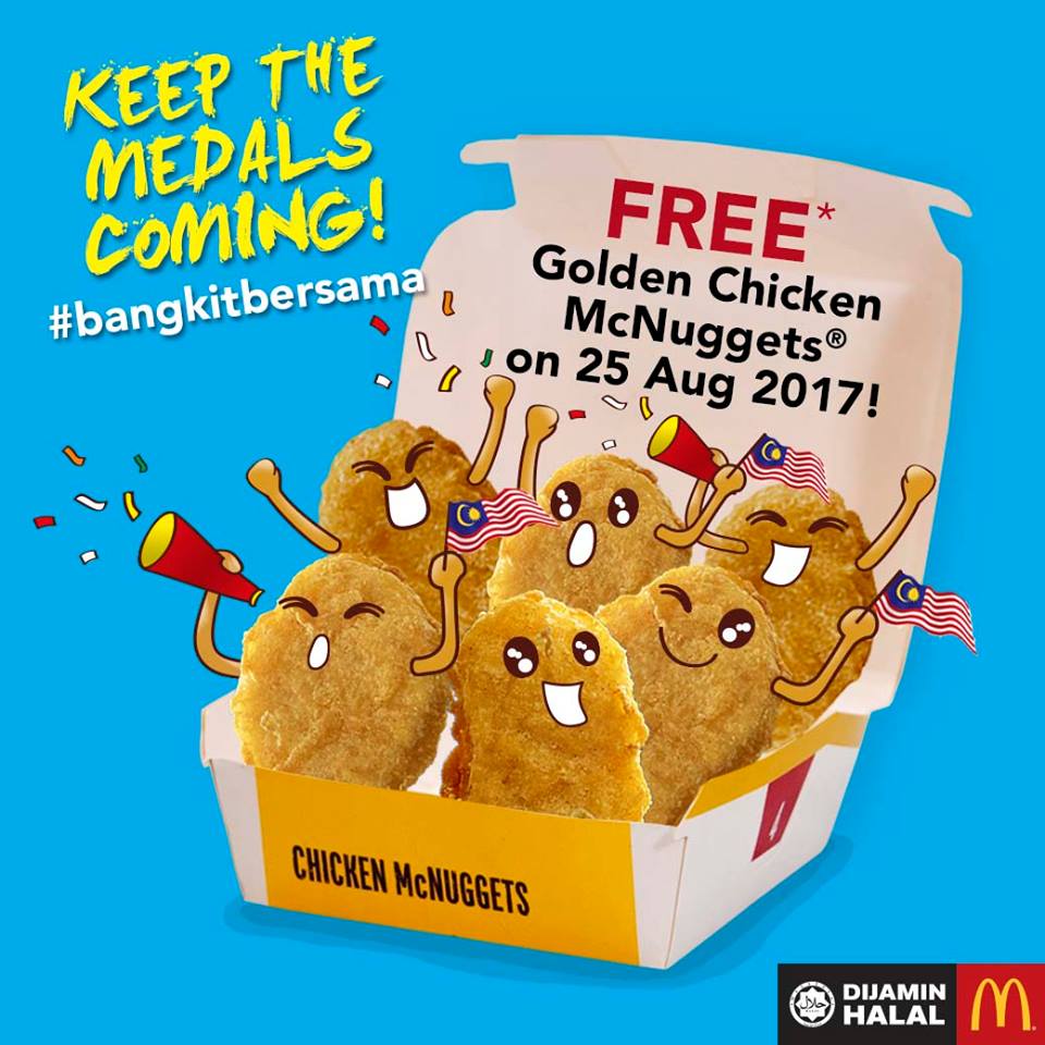 As the Official Restaurant of the SEA Games, McDonald’s is celebrating our athletes’ awesome performance thus far by giving out FREE Golden Chicken McNuggets on 25th August 2017, at all McDonald’s restaurants nationwide.