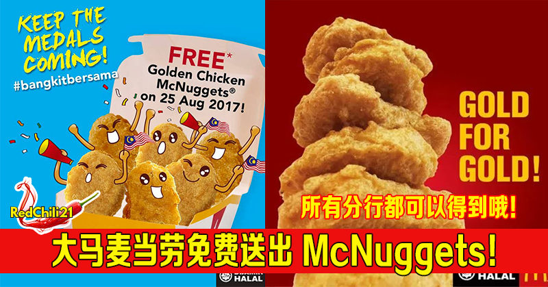 为了欢庆我国选手在Sea Game 的出众表现,McDonald’s特别免费送出 Golden Chicken McNuggets!