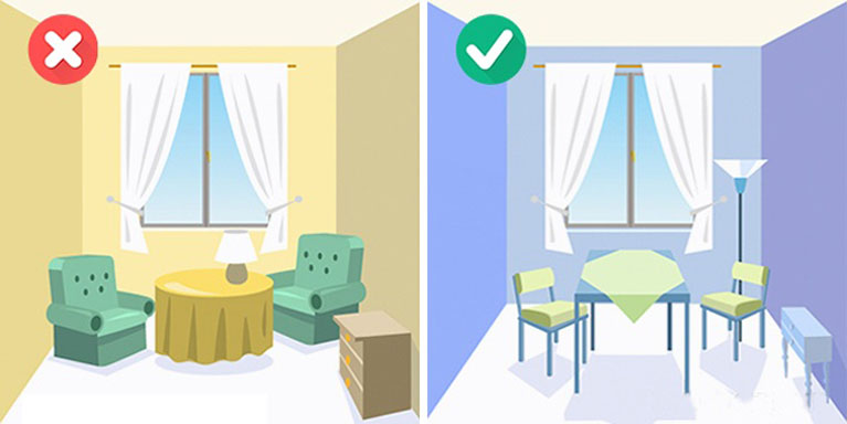 不管是沙发、桌子、柜子、架子…等,都应该要看起来没有那麽笨重。举例来说,沙发椅和一般的椅子在视觉上,就带给我们完全不同的感受。让家具看起来没有那麽佔空间,自然就可以增加家裡的空间啰!