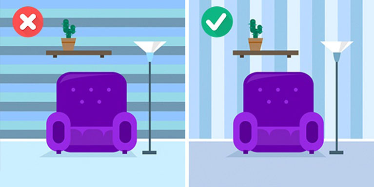 如果你使用偏暗的图案来装饰牆壁,那么在视觉上的效果将会有负面的影响。同时,水平的条纹也无法有效地让家裡看起来更宽大。如果家里的客厅空间本来就不大,那你应该使用浅色系的垂直条纹,这样的设计可以让客厅看起来更宽阔明朗!