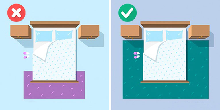 有人也许会认为,房间越小的话,所使用的地毯也要越小。然而,从上面这张图看起来,这个看法应该是错的。虽然房间很小,但如果能让地毯覆盖的面积比例尽可能变大,就能让我们的房间看起来更加宽广一些。