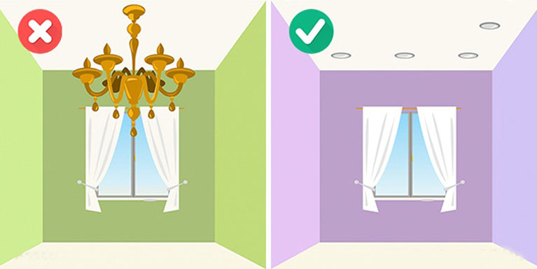 在狭小的空间内,我们必须降低一切不必要的装饰。如果可以在天花板上安装电灯,那当然就要避免使用体积太大的吊灯。吊灯的照明效果不但没有比较好,也会让你家看起来很有压迫感。