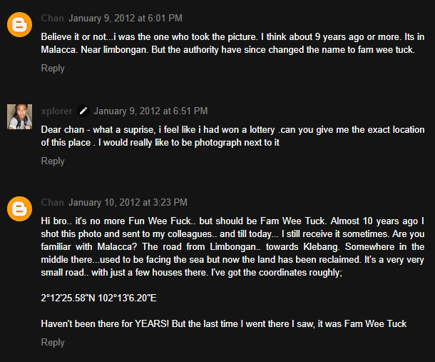 这条路坐落在马六甲的Limbongan 往Klebang的之间,据说这个路名后来被改成Fam Wee Tuck。