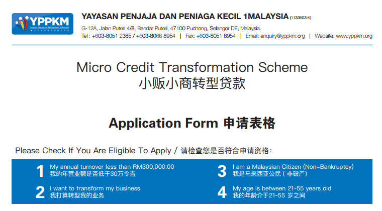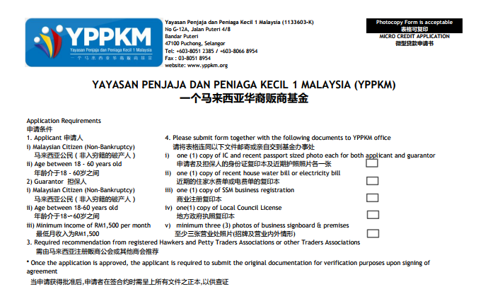 - 申请表格可通过YPPKM办公室、YPPKM网站www.yppkm.org下载或马来西亚注册贩商公会索取。