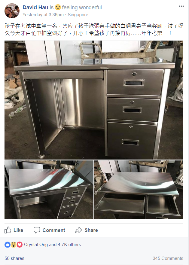 昨日David Hou在新山吹水站分享了这组白钢书桌的照片, 这白钢书桌原来是David Hou 答应如果孩子拿到第一名就会亲手做给他来当做奖励。