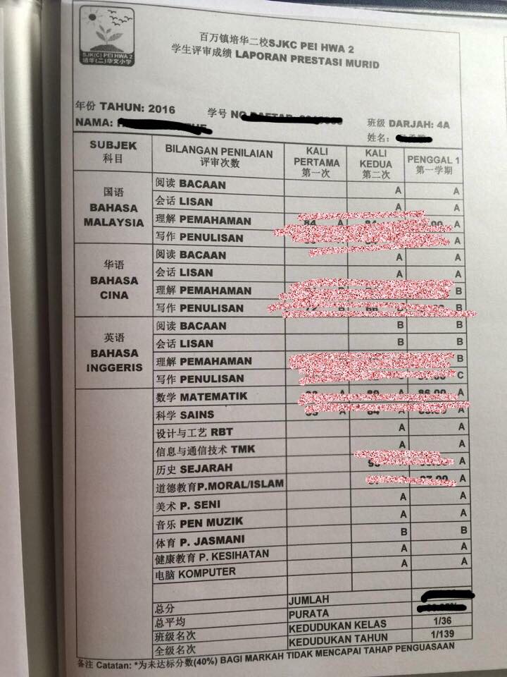 ▼ 帖主David Hou 也贴出了孩子的成绩单,原来真的是第一名eh 而且还是全级第一。