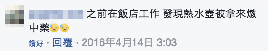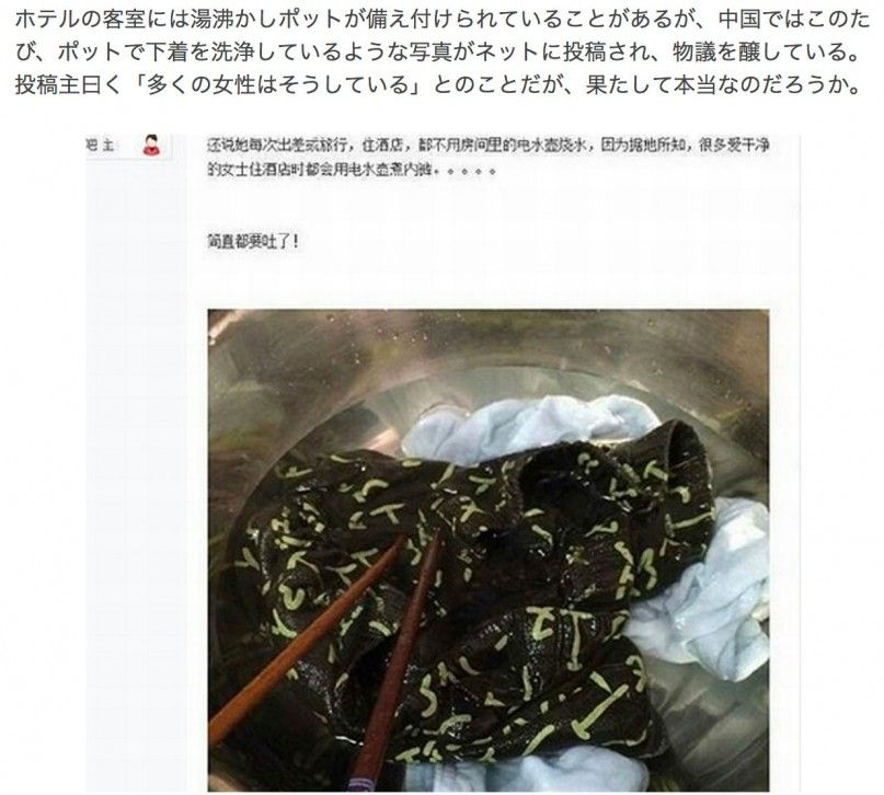 而早前网上亦曾热传,有大陆女生用热水壶煮内裤,原因是:「据她所知,很多爱乾淨的女士住酒店时都会用电水壶煮内裤。」所以她自己也会这样做,她还说:「每次出差或旅行,住酒店,都不用房间里的电水壶烧水,因为简直都要吐了!」