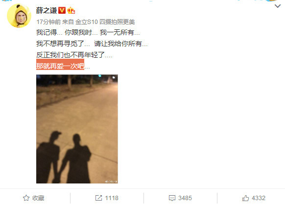 薛之谦先发文称:“我记得…你跟我时… 我一无所有…我不想再寻觅了… 请让我给你所有…反正我们也不再年轻了….那就再爱一次吧…”之后高磊鑫也跟着回应薛之谦,表示愿意。